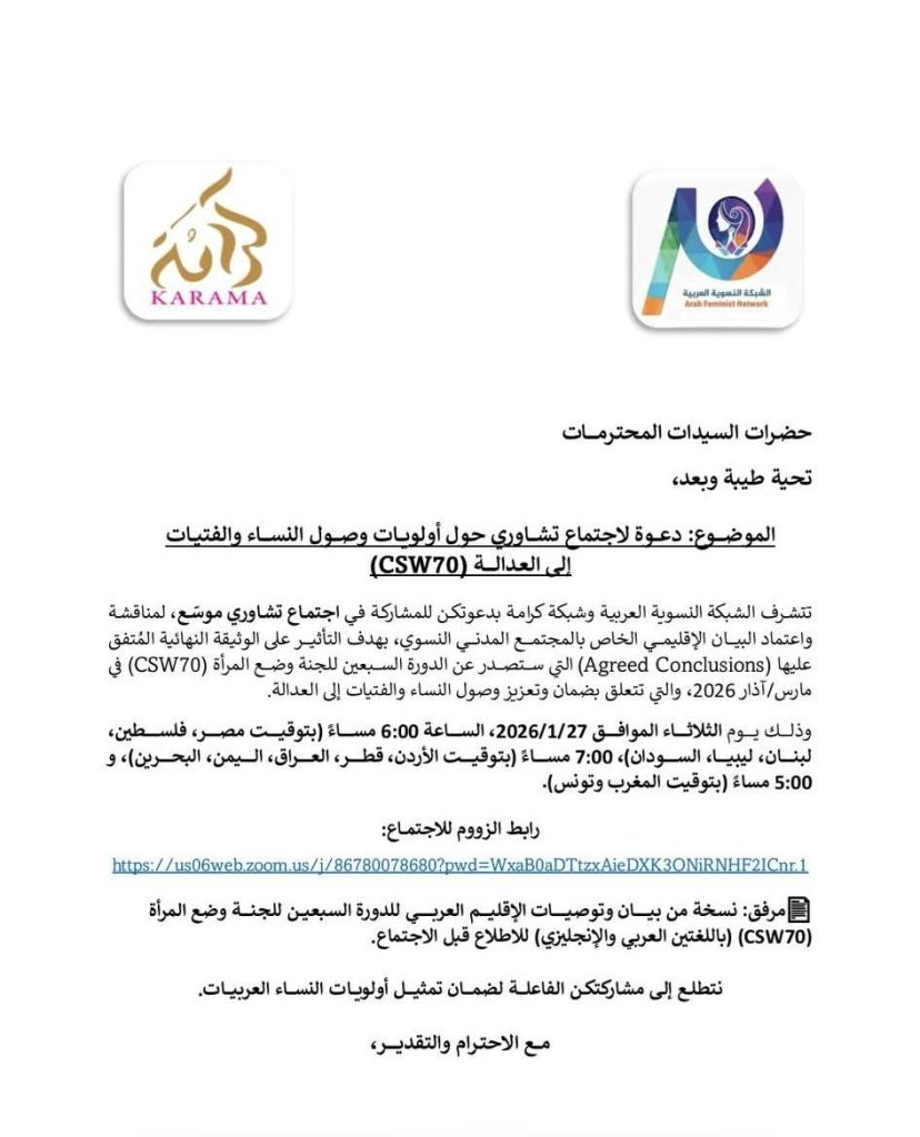 عقدت الشبكة النسوية العربية وشبكة كرامة يوم أمس الثلاثاء 27 كانون الثاني/ يناير 2026 اجتماعًا تشاوريًا موسّعًا بمشاركة 36 مشاركة من الشبكتين، لمناقشة واعتماد البيان الإقليمي الخاص بالمجتمع المدني النسوي، بهدف التأثير على الوثيقة النهائية المُتفق عليها (Agreed Conclusions) التي ستصدر عن الدورة السبعين للجنة وضع المرأة (CSW70) في مارس/آذار 2026، والتي تتعلق بضمان وتعزيز وصول النساء والفتيات إلى العدالة.