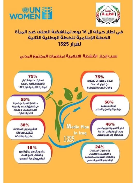 في اطار حملة ال #16يوم_لمناهضة_العنف_ضد_المرأة .. منتدى الإعلاميات العراقيات وبمشاركة 50 منظمة من مختلف مدن العراق وإقليم كردستان .. الإعلان عن شعار منجزات الخطة الإعلامية للخطة الوطنية الثانية لقرار 1325 لمنظمات المجتمع المدني وبدعم من UN Women Iraq هيئة الامم المتحدة للمرأة – العراق