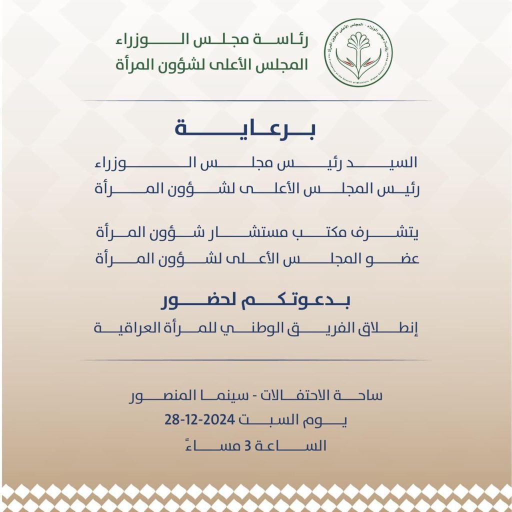 تلبية لدعوة السيد رئيس مجلس الوزراء ورئيس المجلس الاعلى لشؤون المراة /مكتب مستشار شؤون المراة لحضور اطلاق ( الفريق الوطني للمراة العراقية)