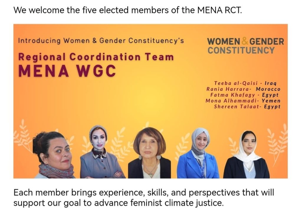 يعتبر الفريق التنسيق الإقليمي الجديد لمنطقة الشرق الأوسط وشمال أفريقيا. يتطلع معًا إلى تعزيز قوتنا الجماعية وتشكيل مستقبل العدالة المناخية النسوية في منطقة الشرق الأوسط وشمال